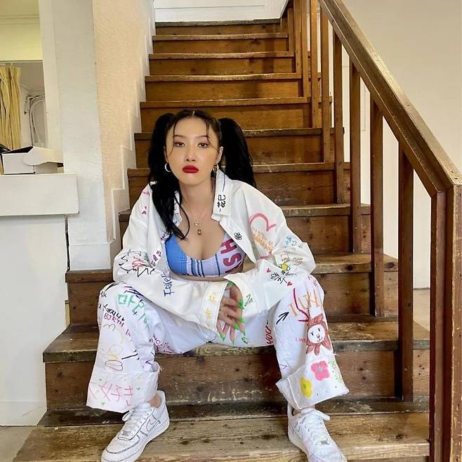 큐티 섹시란 이럴 때 쓰는 말일까? 화사는 어린아이의 낙서 같기도 한 글과 그림이 잔뜩 새겨져 있는 셔츠와 팬츠 셋업을 공개했다. 더듬이 앞머리와 양 갈래 머리 스타일로 깜찍할 것 같지만 브라 톱만 착용해 반전 매력을 뽐냈다. 겉에 셔츠를 챙긴다면, 실외에선 벗고 실내에선 걸쳐 두 가지 매력을 모두 챙길 수 있으니 기억해두자.