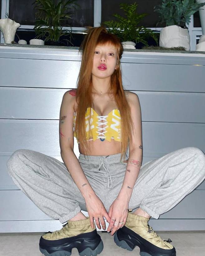 현아의 사진을 본 사람들이라면 사진 속 브라 톱을 보고 가히 놀랐을 것이다. 이것은 바로 현아&던 커플의 스타일리스트로 알려진 두호님의 작품! 처음 보는 이 브라 톱은 뉴발란스 운동화를 직접 오리고 붙여서 만든 DIY 아이템이라고. 이전에도 루이뷔통 백을 리폼해 브라 톱을 만들었던 걸 생각하면 아마도 스타일리스트 두호의 작업 시리즈일 듯 싶다.