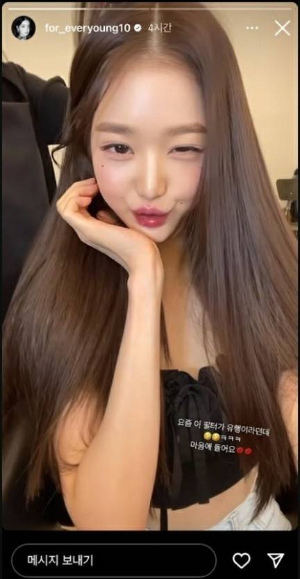 갸름한 얼굴, 새빨간 입술, 큰 눈과 장원영의 트레이드마크 얼굴 점까지! 필터만 써도 장원영으로 변신할 수 있는 인스타그램 필터를 제작한 그녀의 팬! 젠지들 사이에서 슬금슬금 입 소문이 나더니 실제 장원영이 이 필터를 사용해 인증샷까지 올리기도 했다! 생각보다 어색함 없이 장원영인 듯 아닌 듯 매력적인 얼굴로 변신시켜 주니, 오늘 셀카는 장원영 필터를 적극 활용해 볼 것!