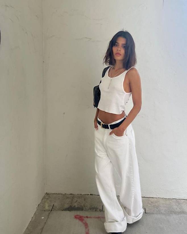 젠 체발로스의 클로그 패션은 모던 & 심플의 정석! 화이트 탱크톱과 같은 컬러의 와이드 팬츠를 매치한 그는 기장이 긴 팬츠의 밑단을 무심하게 접어 힙하게 연출했다. 올 화이트 룩에 클로그를 비롯한 다른 액세서리들은 모두 블랙 컬러로 통일해 세련된 무드를 강조한 것이 특징.