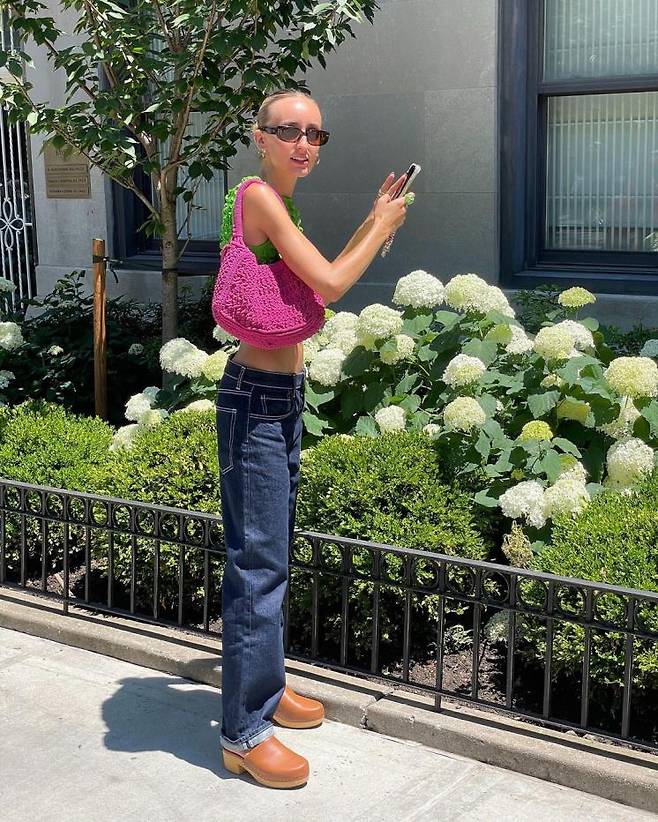 키치하고 귀여운 패션 센스 소유자인 로렌 라디에는 쨍한 그린 컬러의 퀼티드 톱과 생지 데님 팬츠를 매치했다. 여기에 비비드 핑크 컬러의 니팅 백으로 컬러 포인트를 더한 뒤, 소프트한 브라운 클로그를 선택해 룩을 마무리 했다.