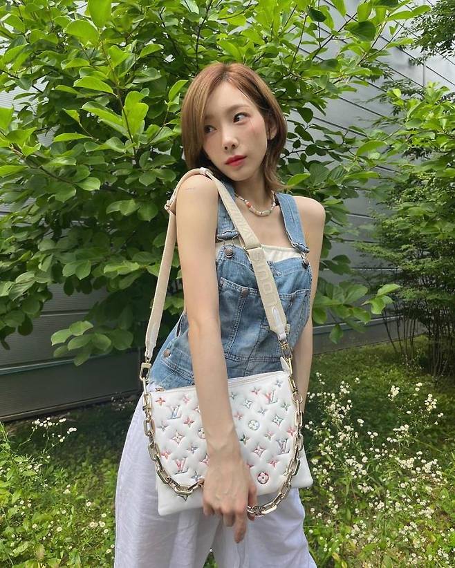 소녀시대에서 청량미를 담당하고 있는 태연. 맑고 투명한 피부에 얹어진 데님 베스트와 화이트 팬츠, 블루 캡 모자 덕에 더욱 쿨해 보인다. 알록달록한 모노그램 패턴의 쿠상 백과 퍼펙트 매치!