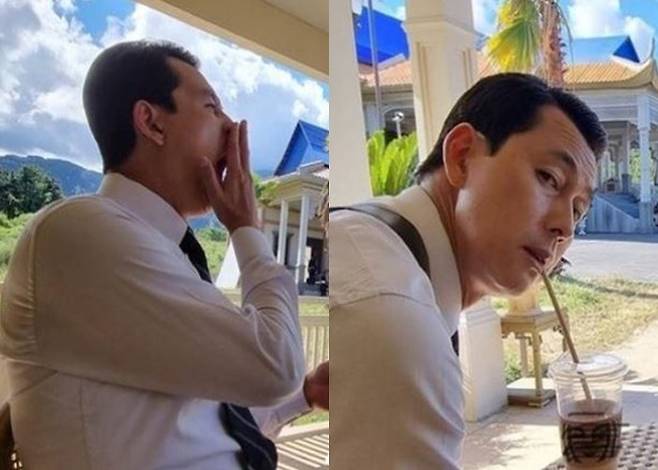 정우성은 촬영 중 근황을 전했다. 휴식을 취하며 하품을 하고 있는 모습에서조차 카리스마를 풍겨 감탄을 자아낸다.