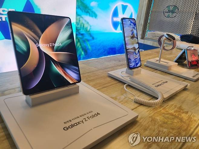 (서울=연합뉴스) 임성호 기자 = 12일 서울 강남구 가로수길의 편집숍 '나이스웨더' 매장에 꾸려진 'KT Yx나이스웨더 팝업스토어'에 삼성전자 갤럭시Z플립4와 갤럭시Z폴드4, 갤럭시워치5 등 신제품이 전시돼 있다. 2022.08.12