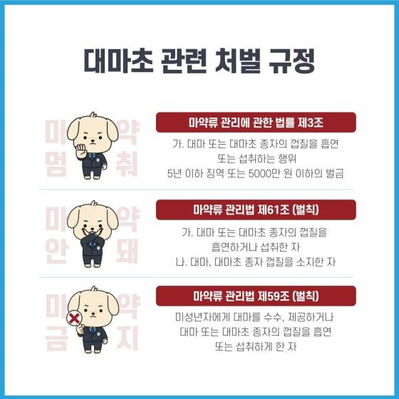 「마약류 관리에 관한 법률 제3조」 가. 대마 또는 대마초 종자의 껍질을 흡연 또는 섭취하는 행위 5년 이하 징역 또는 5000만 원 이하의 벌금