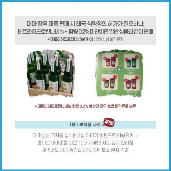 - 대마 함유 제품 판매 시 태국 식약청의 허가가 필요하나, 테트라히드로칸나비놀 함량 0.2% 미만이면 일반 상품과 같이 판매