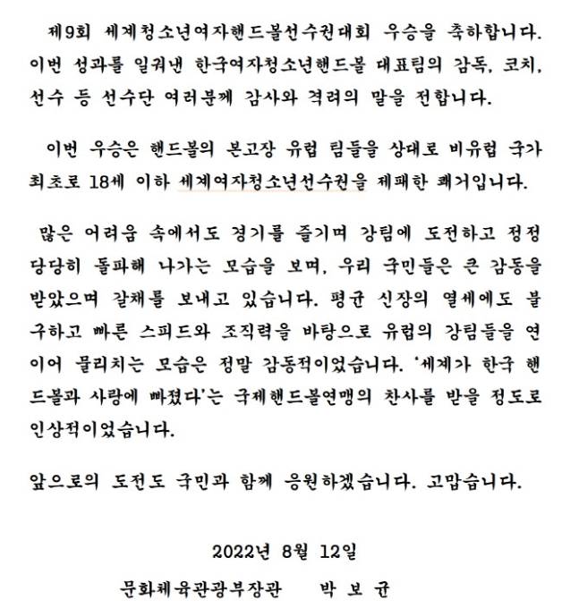 문화체육관광부(이하 문체부) 박보균 장관이 세계청소년핸드볼선수권대회(18세 이하 : U-18)에서 우승한 한국 여자 청소년 대표팀이 축전을 보냈다.