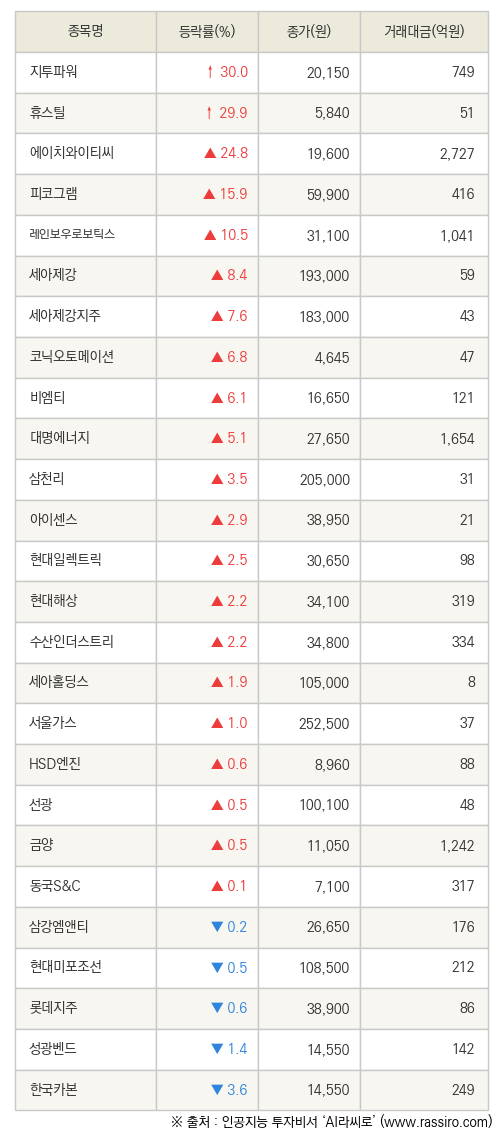 특히 지투파워는 전 거래일 대비 30.0% 오른 20,150원에 거래를 마감하여 높은 관심을 받았다.