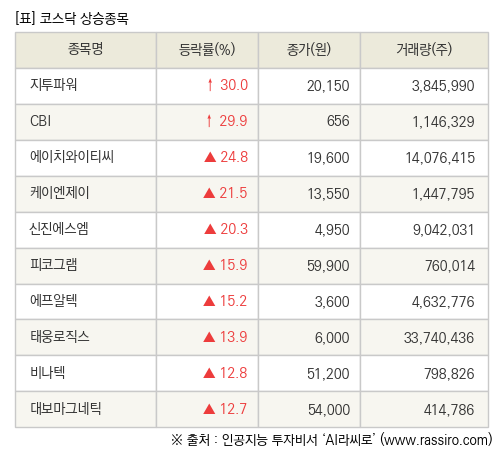 [fnRASSI]장마감, 코스닥 상승 종목(지투파워 30.0% ↑)