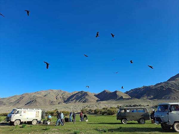 | ▲ 몽골 서쪽끝 도시 '바얀 오르기'는 겨울철이면 독수리축제로 유명한 도시다. 그래서인지 고조선유적답사단 일행이 바얀 오르기 근처 강가에서 야영을 하자 고기냄새를 맡은 독수리들이 상공을 날고 있다. |