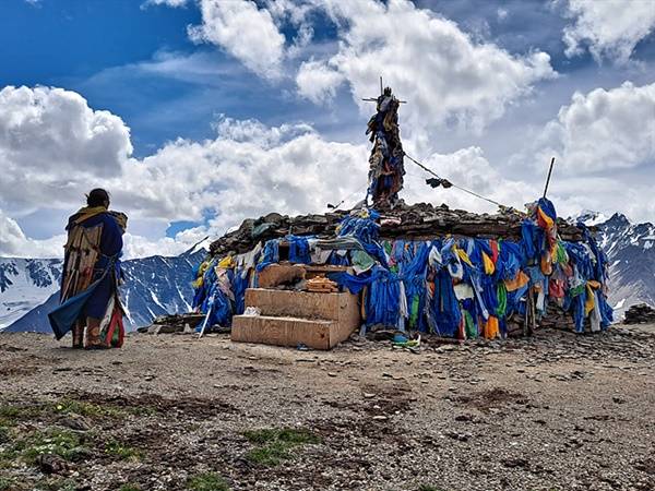 | ▲ 몽골에서 가장 높은 타왕복드산 인근 부리야트 샤먼이 푸른 옷을 입고 오보를 돌고있다. 오보에는 '푸른색' 하닥이 걸려있어 몽골인들이 '푸른색'을 얼마나 중시하는 지 짐작할 수 있다. |