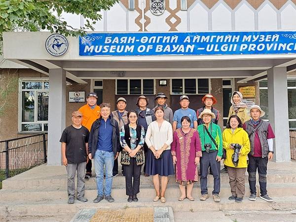 | ▲ 바얀 오르기 박물관 견학을 마친 고조선유적답사단 일행이 박물관 앞에서 기념촬영했다. 맨 앞줄 왼쪽에서 네번째가 '아즈맽' 박물관장이다. |