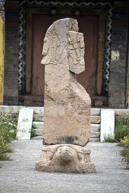 | ▲ 체체를렉 박물관 석비에는 돌궐제국의 왕족이었던 '마한 테긴'의 기념비가 있다. 582년에 세워진 높이 2.45m 석비의 맨 윗부분을 자세히 살펴보면 늑대가 어린아이에게 젖을 빨리는 모습이 보인다. 알타이를 중심으로 한 서몽골계통(튀르크계) 몽골인들은 늑대 토템신앙이 있다. |