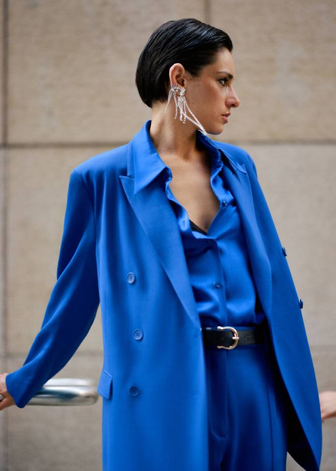 비비드한 사파이어 블루 컬러의 팬츠 슈트는 분위기를 고조시키고, 여기에 골지 크롭 롤넥 니트나 실키한 셔츠를 함께 스타일링해 볼 것을 권한다.