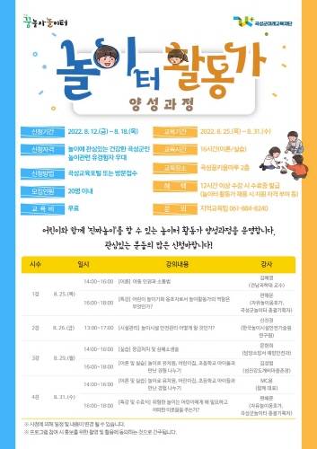 곡성군미래교육재단이 주민이 주도하는 놀이문화 확산을 위해 '꿈놀자 놀이터활동가 양성과정' 참여자를 모집한다고 12일 밝혔다.