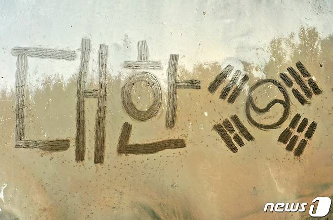 (포항=뉴스1) 최창호 기자 = 서예가 김동욱씨가 12일 제77주년 광복절을 앞두고 경북 포항시 북구 영일대해수욕장 백사장에서 대형 태극기를 그리며 광복절 의미를 되새기고 있다..(서예가 김동욱 씨 제공) 2022.8.12/뉴스1