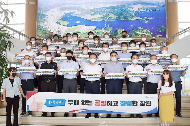 창원특례시(시장 홍남표)는 12일 시청 본관에서 홍남표 창원특례시장을 비롯한 4급 이상 고위 공직자 40여명이 참석한 가운데 부패 척결과 청렴한 공직문화 확산을 위해 ‘청렴실천 결의 및 다짐 퍼포먼스’를 가졌다.