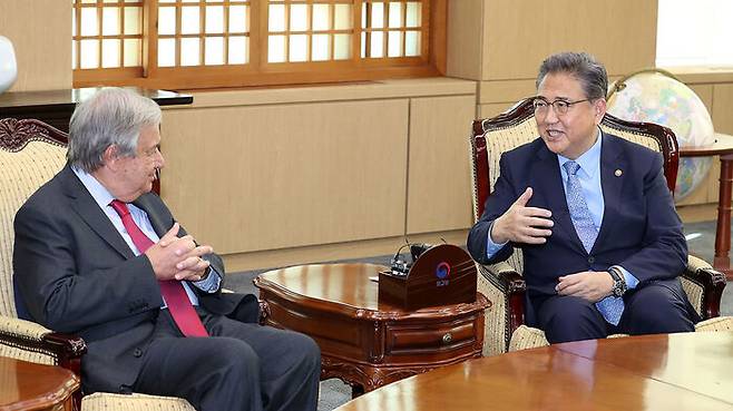 박진 외교부 장관은 오늘(12일) 오후 서울 종로구 외교부 청사에서 안토니우 구테흐스 유엔사무총장을 접견하고 글로벌 중추 국가로 나아가기 위해 유엔과 협력을 강화하겠다고 밝혔습니다.