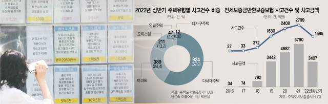 2016년만 해도 27건, 34억 원 규모에 그쳤던 전세보증금반환보증보험 사고는 지난해 2799건, 5790억 원으로 5년 만에 폭증했다. 특히 2018년 이후 증가세가 확연히 가팔라졌다. 가입 연령별로 보면 MZ세대를 노리는 경향도 두드러진다. 올 상반기 연령별 사고 건수는 30대가 796건으로 가장 많았고 이어 20대(322건), 40대(289건) 순이었다. 2019년까지는 20대(22건)와 30대(488건)를 합쳐도 40대의 589건에 못 미쳤었다. 주택 유형별로는 올 상반기 전체 사고 중 다세대주택 관련이 924건(57.9%)으로 과반이었다. 그다음으로 아파트(389건·24.4%), 오피스텔(211건·13.2%) 등이었다. 신혼부부와 사회초년생이 감당할 만한 3억 원 이하 신축 빌라 등에서 사고가 집중된 셈이다.