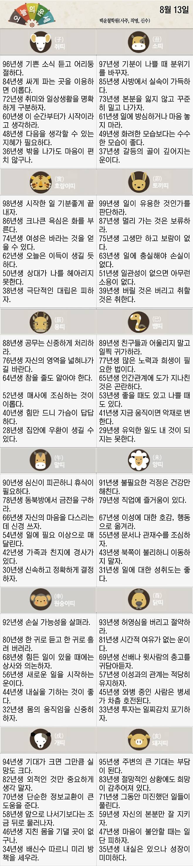 [재미로 보는 오늘의 운세] 8월 13일 (토요일)
