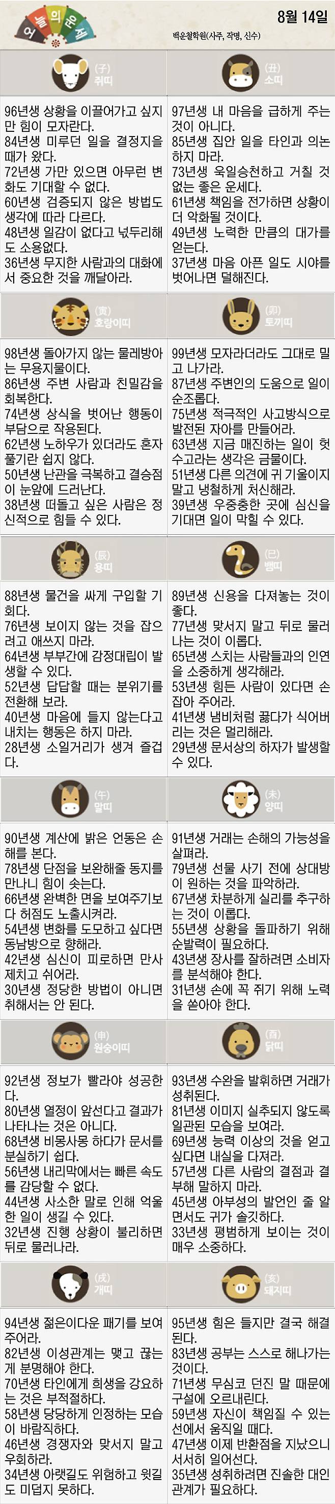 [재미로 보는 오늘의 운세] 8월 14일 (일요일)