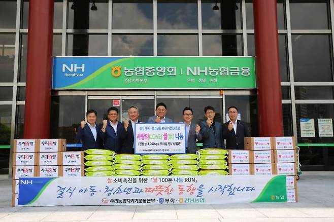 우리농업지키기운동본부(대표 김용택)는 12일 경남향토기업 무학(회장 최재호), 경남농협(본부장 김주양)과 함께 결식 아동청소년을 위한 사랑의 쌀 나눔 전달식을 경남농협 본관에서 가졌다.