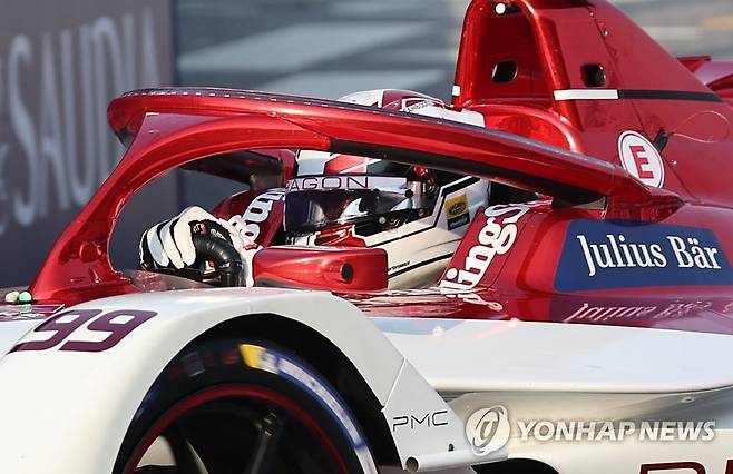(서울=연합뉴스) 홍해인 기자 = 12일 서울 송파구 잠실올림픽주경기장에서 '2022 하나은행 서울 E-프리(E-Prix)' 15라운드 개막을 하루 앞두고 열린 성능시험운전(Shakedown)에 참여한 드래곤/펜스케 오토스포츠 팀 안토니오 지오비나치(이탈리아)의 경주차가 트랙을 질주하고 있다.
