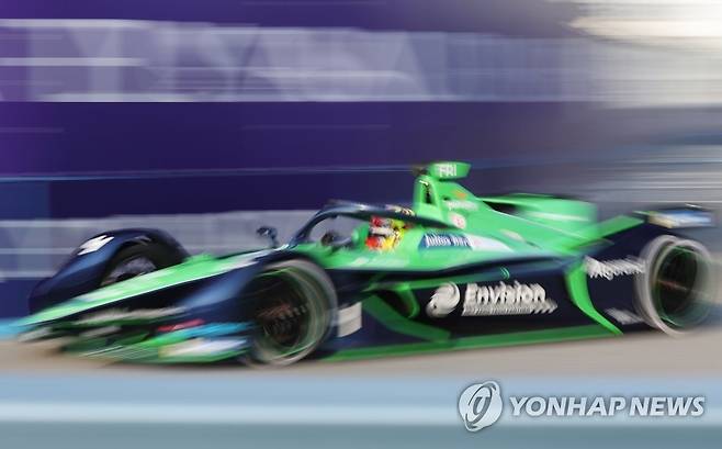 (서울=연합뉴스) 홍해인 기자 = 12일 서울 송파구 잠실올림픽주경기장에서 '2022 하나은행 서울 E-프리(E-Prix)' 15라운드 개막을 하루 앞두고 열린 성능시험운전(Shakedown)에 참여한 엔비전 레이싱 팀 닉 캐시디(뉴질랜드)의 경주차가 트랙을 질주하고 있다.