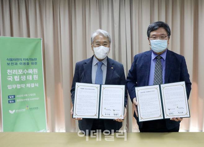 [이데일리 김태형 기자] 조도순(왼쪽) 국립생태원과 김용식 천리포수목원장이 12일 천리포수목원에서 식물교류 네트워크 활성화를 통한 종 보전과 생물다양성 증진에 기여하기 위해 업무협약을 체결하고 있다.