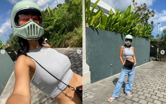 공개된 사진 속 그는 헬맷에 오렌지색 선글라스와 민소매 브라탑에 박시한 진을 매치하며 자유롭고 캐쥬얼한 무드를 연출했다.