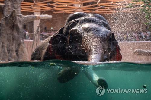 epa10116989 An Asian elephant cools off at the zoo during the World Elephant Day in Lodz, central Poland, 12 August 2022. The World Elephant Day is observed every year on August 12. EPA/GRZEGORZ MICHALOWSKI POLAND OUT