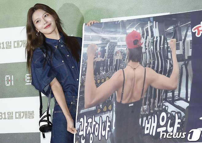 (서울=뉴스1) 권현진 기자 = 소녀시대 수영이 12일 오후 서울 강남구 코엑스 메가박스에서 열린 영화 ‘리미트’ VIP시사회에서 헬스메이트 배우 진서연을 응원하고 있다.