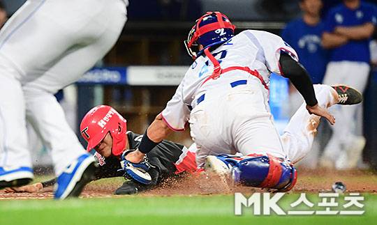 9회초 1사 2루에서 KIA 고종욱의 좌전안타때 2루주자 김도영이 홈으로 파고 들다 삼성 강민호 포수에게 태그아웃 되고 있다.
