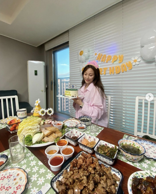 공개된 사진 속 그는 생일 축하한다는 뜻의 가렌더로 꾸며진 베란다 앞에서 분홍색 왕관을 쓰고 행복을 만끽하는 모습이다. 특히 그의 손에 담긴 케이크와 큰 상을 채우는 반찬들, 그의 옆에 놓인 선글라스와 노란 고깔모자까지 눈길을 끈다.