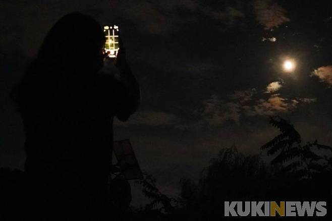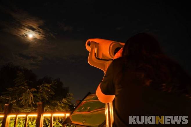 12일 오후 경기 고양시 행주산성 역사공원을 찾은 한 시민이 망원경으로 올해 마지막으로 볼 수 있는 슈퍼문 '철갑상어 달'을 감상하고 있다.