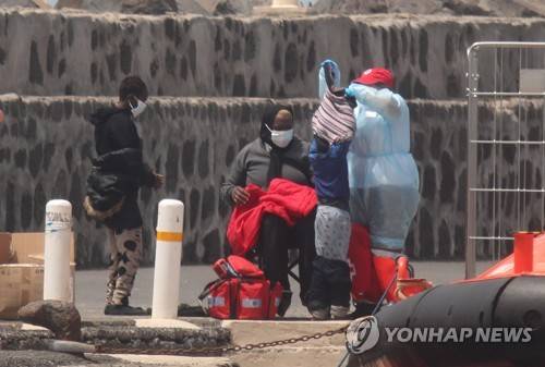 epa10117244 Migrants in the port of Arrecife, Canary Islands, Spain, 12 August 2022. The Salvamar Al Nair ship of maritime salvage, returned to the port with the 75 people, including nine children, rescued in the eighth skiff located in the last hours in waters near Lanzarote. EPA/ADRIEL PERDOMO