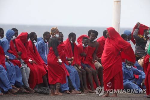 epa10117248 Migrants in the port of Arrecife, Canary Islands, Spain, 12 August 2022. The Salvamar Al Nair ship of maritime salvage, returned to the port with the 75 people, including nine children, rescued in the eighth skiff located in the last hours in waters near Lanzarote. EPA/ADRIEL PERDOMO