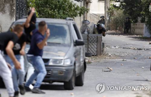 epa10117266 Palestinian protesters throw stones at Israeli troops during clashes after a demonstration against Israel's settlements on the lands of Kafr Qadoum village near the West Bank city of Nablus, 12 August 2022. EPA/ALAA BADARNEH