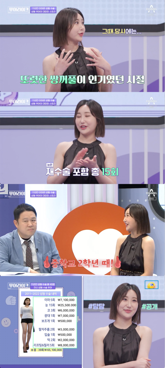 12일 전파를 탄 채널A '푸어라이크'에서 약 40번의 성형수술과 시술로 전신에 6,500만 원을 소비한 '성형푸어'가 등장했다.