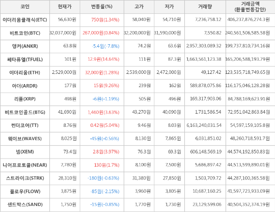 또한, 아더(9.26%, 177원), 썬더코어(5.04%, 8.76원), 넴(3.97%, 73.4원), 비트코인골드(3.63%, 41,690원), 니어프로토콜(1.7%, 7,780원), 이더리움클래식(1.34%, 56,630원), 이더리움(1.28%, 2,529,000원)이 상승세를 나타냈다.