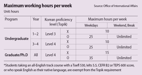 International students like Hasegawa, who obtained a Test of Proficiency in Korean (Topik) level 4, can work up to 25 hours from Monday to Friday and unlimited hours during weekends and holidays. Those without the Topik level 4 certificate are limited to just 10 hours weekly.