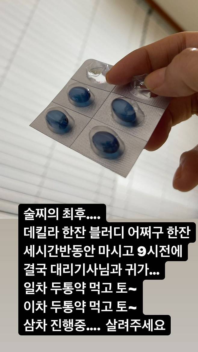 이후 "술찌의 최후....데킬라 한잔 블러디 어쩌구 한잔 세 시간 반동안 마시고 9시 전에 결국 대리기사님과 귀가...일차 두통약 먹고 토~ 이차 두통약 먹고 토~ 삼차 진행 중...살려주세요"라며 상태를 알렸다.