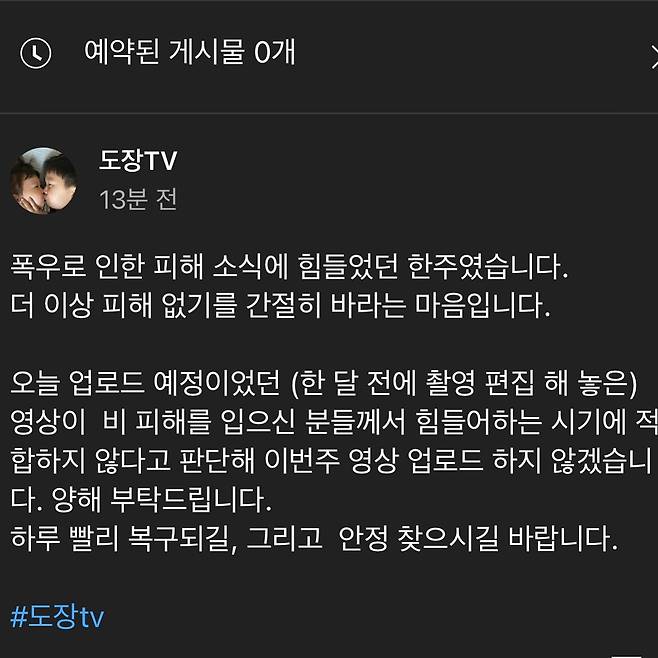 도경완은 "오늘 업로드 예정이었던 (한 달 전에 촬영 편집 해놓은) 영상이 비 피해를 입으신 분들께서 힘들어하는 시기에 적합하지 않다고 판단해 이번주 영상 업로드 하지 않겠습니다. 양해 부탁드립니다"라고 설명했다.