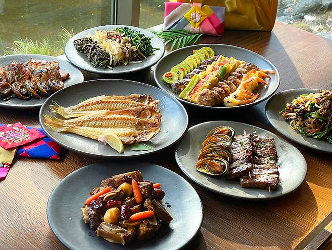 먼저 단품 메뉴로는 애호박전, 표고버섯전, 삼색꼬치전, 완자전, 새우전 각 10개씩으로 구성된 '모둠전 5종(5만5,000원)'과 소고기 산적(500g), 제주 흑돼지 산적(500g)과 전복찜 10개가 포함된 '산적 2종&전복찜(15만원)', 고사리, 시금치, 도라지, 표고버섯 각 300g씩으로 구성된 '나물 4종(4만5,000원)', 소갈비찜(800g)과 잡채(300g)로 구성된 '소갈비찜&잡채(10만원)',