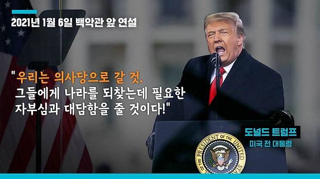오후 1시. 펠로시 하원의장이 의사봉을 두드려 개회를 선언했고, 동시에 건물 밖에서 시위대는 경찰 1차저지선을 돌파했다. 1시5분. 트럼프는 이런 말로 연설을 마쳤다.