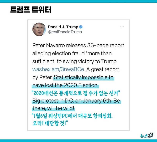 5일 뒤 트럼프는 새해(2021년) 1월6일 워싱턴에 모여 한바탕 대규모 항의시위를 벌이도록 지지자들을 선동하는 트윗을 날린다.