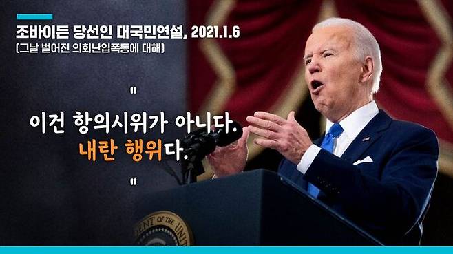 공화당 의원들과 백악관 내부 법률고문들조차 '인정해야 한다'는 선거결과를, 대통령이 광적 지지자 집단의 폭력으로 뒤집으려 한 사건이었다. 미국의 민주주의는 큰 타격을 입었다. 우리식 작명법으로 부르자면 '1.6사태'라 할 만한 일이었다.