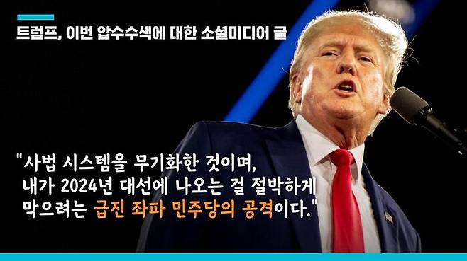 트럼프는 중간선거를 넘어 2024 대선 출마를 시사하는 동영상도 공개했다. 이번 압수수색을 정치적 기회로 반전시켜 출마선언을 앞당기는 형국이다. 민주당이 자신에게 자행하는 "불법, 정치적 박해, 마녀사냥을 폭로하고 막아야 한다"며 지지자들에게 모금 이메일도 보냈다. 이 승부, 어떻게 될까?