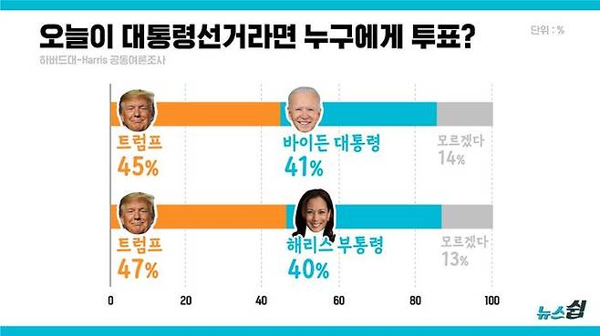 하버드대 미국정치연구센터(CAPS)와 여론조사 기관(Harris)이 지난7월 27~28일 조사한 결과, 트럼프는 바이든 대통령과 해리스 부통령 모두에게 소폭 우세를 보이는 것으로 나타나긴 했다. 미국 성인 1천8백80여 명을 대상으로 '오늘 당장 대선이 열리면 누구를 뽑겠느냐'고 물었더니, 트럼프 45%, 바이든 41%였고, '누구를 찍어야할지 모르겠다'가 14%나 나온 것이다. 바이든 대통령의 낮은 인기, 조사의 오차한계 등까지 감안하면 트럼프 스스로도 별로 안심이 안될 결과다.