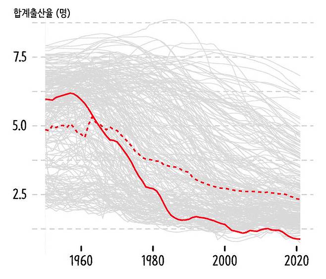맬서스나 타노스나, 그들이 고민했던 인구의 폭발적 증가는 더 이상 우리 인류의 고민이 아닙니다. 지금 걱정해야 하는 건 도리어 감소하는 인구죠. 데이터로 살펴볼까요? 2021년 UN에서 발표한 인구 데이터를 가지고 1950년부터 2021년까지 전 세계 국가들의 합계출산율 변화를 나타내 봤어요. 합계출산율은 가임 여성(15~49세) 1명이 평생 동안 낳을 것으로 예상되는 평균 출생아 수를 뜻합니다. 위의 그래프에서 점선으로 표시된 건 전 세계의 출산율입니다. 1950년 전 세계 여성 1인당 자녀수는 4.86명. 하지만 2021년에는 2.32명으로 절반 이하로 떨어졌죠. 굵은 선으로 표시된 우리나라는 특히 더 심각한 상황입니다.